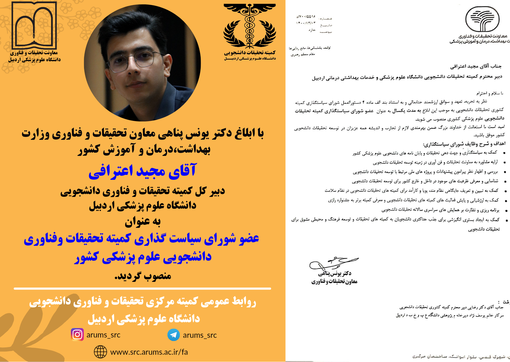 با ابلاغ دکتر یونس پناهی معاون تحقیقات و فناوری وزارت بهداشت، آقای مجید اعترافی دبیر کل کمیته تحقیقات و فناوری دانشجویی دانشگاه عوم پزشکی اردبیل به عنوان عضو شورای سیاست گذاری کمیته تحقیقات و فناوری دانشجویی علوم پزشکی کشور منصوب گردید.