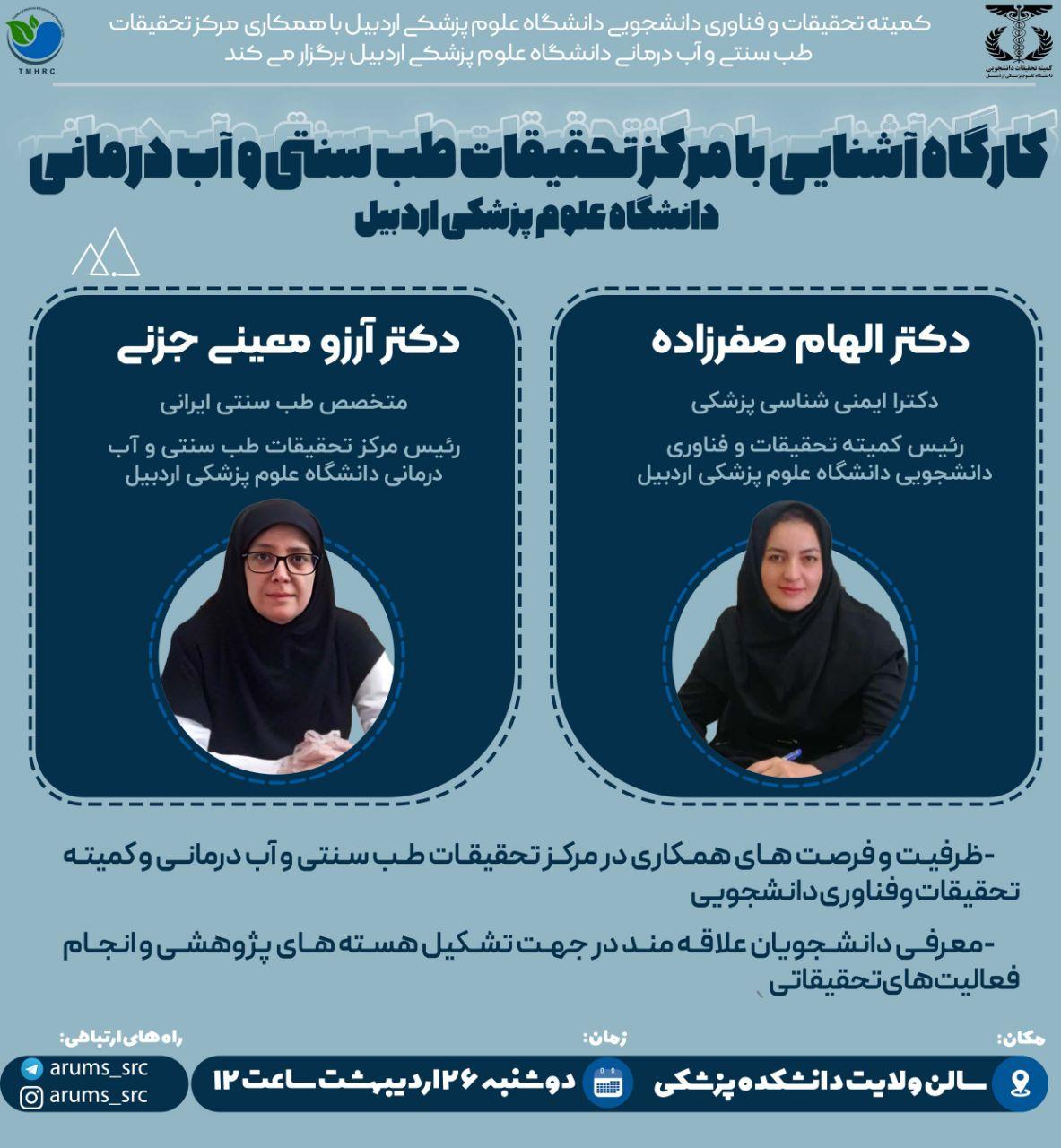 کمیته مرکزی تحقیقات و فناوری دانشجویی دانشگاه علوم پزشکی اردبیل با همکاری مرکز تحقیقات طب سنتی و آبدرمانی دانشگاه برگزار می کند :
