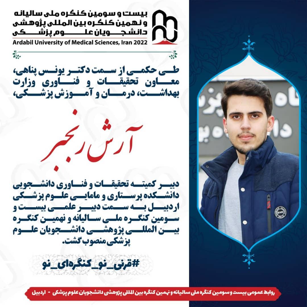 طی حکمی از سمت دکتر یونس پناهی، معاون تحقیقات و فناوری وزارت بهداشت، درمان و آموزش پزشکی، آرش رنجبر ؛ دبیر کمیته تحقیقات و فناوری دانشجویی دانشکده پرستاری و مامایی دانشگاه علوم پزشکی اردبیل به سمت دبیر علمی بیست و سومین کنگره ملی سالیانه و نهمین کنگره بین المللی پژوهشی دانشجویان علوم پزشکی منصوب گردید.