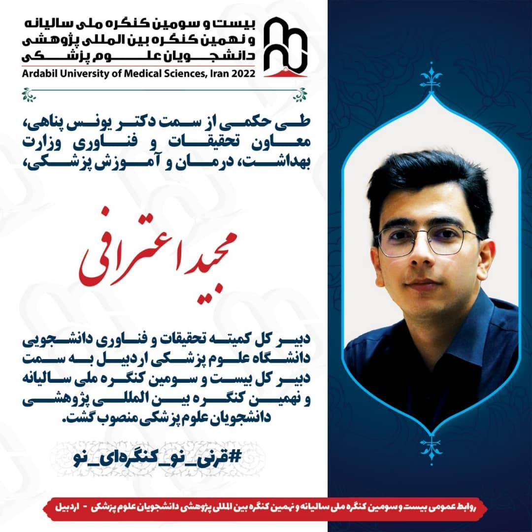 طی حکمی از سمت دکتر یونس پناهی، معاون تحقیقات و فناوری وزارت بهداشت، درمان و آموزش پزشکی، مجید اعترافی؛ دبیر کل کمیته تحقیقات و فناوری دانشجویی دانشگاه علوم پزشکی اردبیل به سمت دبیر کل بیست و سومین کنگره ملی سالیانه و نهمین کنگره بین المللی پژوهشی دانشجویان علوم پزشکی منصوب گردید.