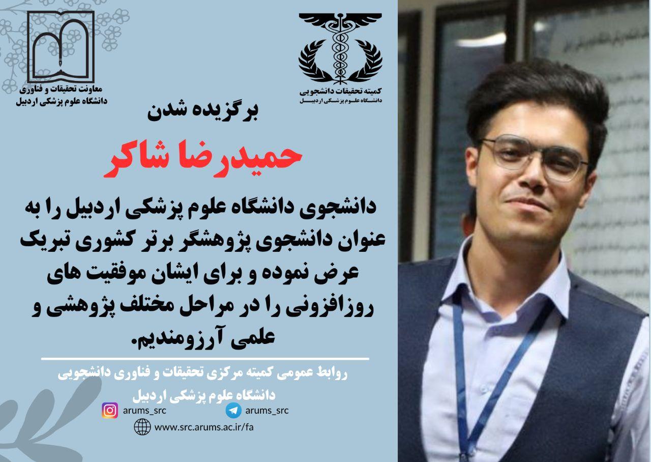 انتخاب جناب آقای حمیدرضا شاکر دانشجوی دانشگاه علوم پزشکی اردبیل به عنوان دانشجوی پژوهشگر برتر کشوری