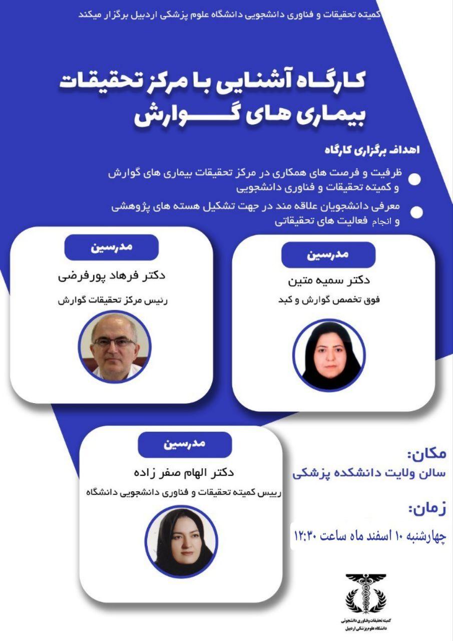 قابل توجه دانشجویان علاقمند به پژوهش و ثبت طرح های تحقیقاتی، در این کارگاه موضوعات و اولویت های پژوهشی در حیطه بیماری های گوارش ارائه خواهد شد و دانشجویان میتوانند با استفاده از موضوعات پیشنهادی اقدام به ثبت طرح های تحقیقاتی خود کنند و از حمایت های کمیته تحقیقات و فناوری دانشجویی بهره مند شوند.