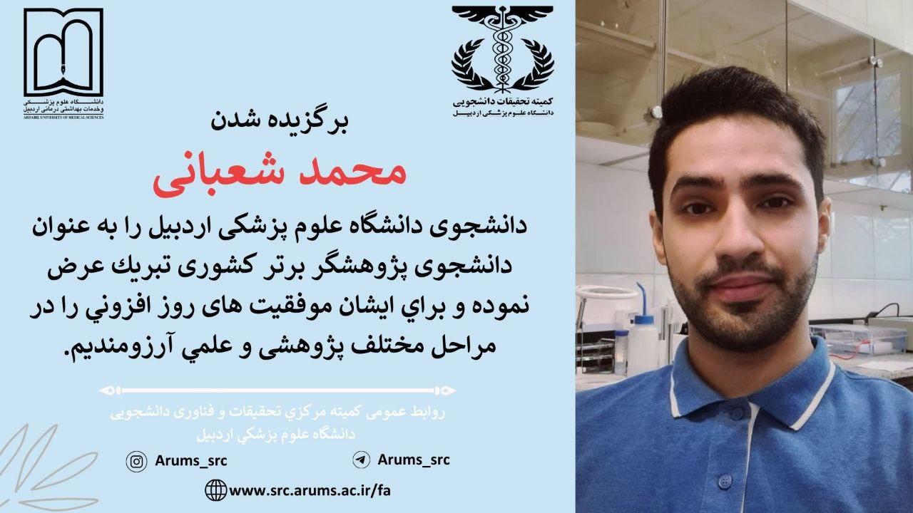 انتخاب جناب آقای محمد شعبانی دانشجوی دانشگاه علوم پزشکی اردبیل به عنوان دانشجوی پژوهشگر برتر کشوری
