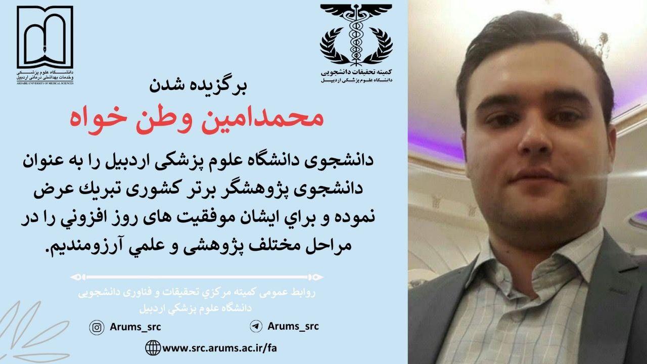 برگزیده شدن آقای محمد امین وطن خواه دانشجوی دانشگاه علوم پزشکی اردبیل را به عنوان دانشجوی پژوهشگر برتر کشوری تبریک عرض مینماییم. و برای ایشان موفقیت های بیشتری را در مراحل پژوهشی و علمی آرزومندیم.