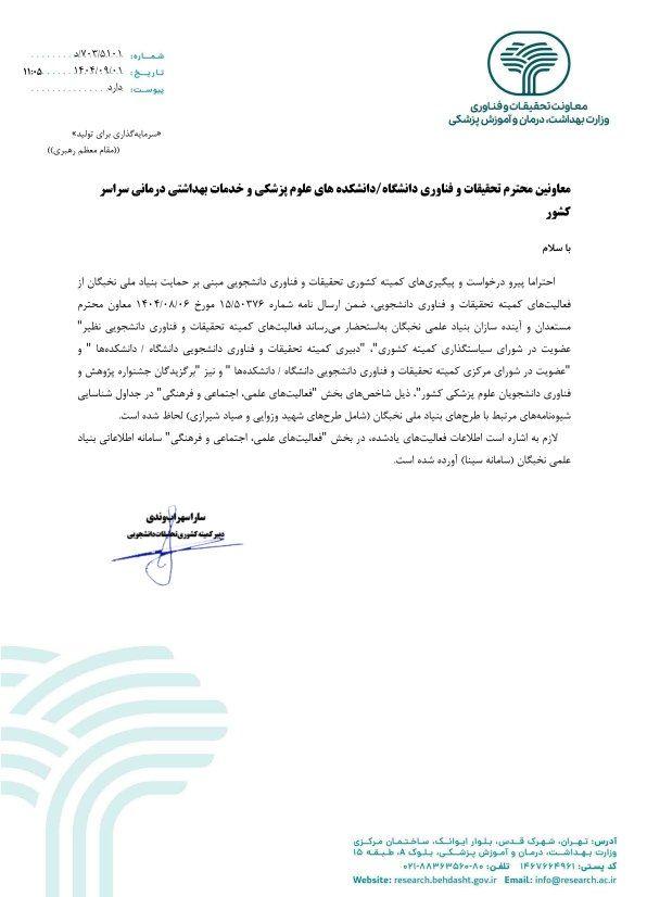 طبق اعلام جدید، تمامی فعالیتهای شما در کمیته تحقیقات و فناوری دانشجویی، مطابق آنچه در این نامه ذکر شده است، در چارچوب شیوهنامههای مرتبط با طرحهای بنیاد ملی نخبگان (شامل طرحهای شهید وزوایی و صیاد شیرازی)، به عنوان بخشی از فعالیتهای علمی، اجتماعی و فرهنگی لحاظ شده است و قابل محاسبه و امتیازدهی خواهد بود.