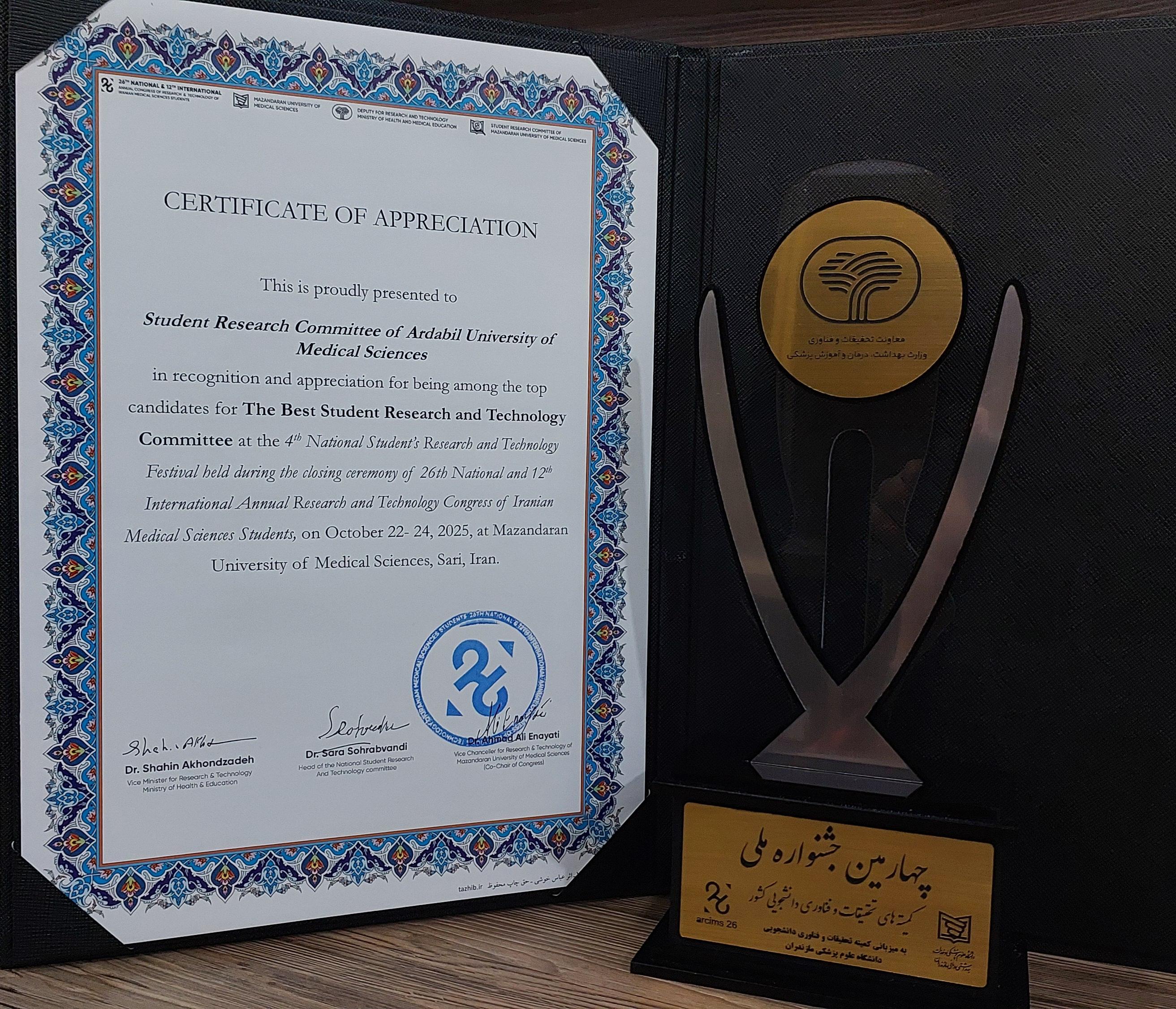 کمیته تحقیقات و فناوری دانشجویی دانشگاه علوم پزشکی اردبیل برای سومین سال متوالی به عنوان کمیته برتر (پنج ستاره و اول) در بین دانشگاههای علوم پزشکی تیپ دو کشور انتخاب شد.