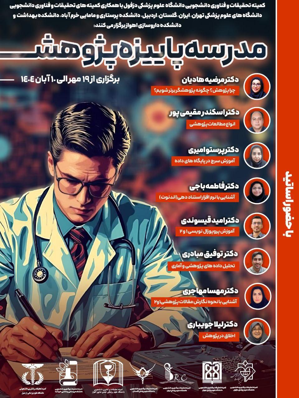 کمیته تحقیقات و فناوری دانشجویی دانشگاه علوم پزشکی دزفول با همکاری کمیته های تحقیقات و فناوری دانشجویی دانشگاه های علوم پزشکی تهران، ایران، گلستان، اردبیل، دانشکده بهداشت و داروسازی اهواز و دانشکده پرستاری و مامایی خرم آباد برگزار می کند: